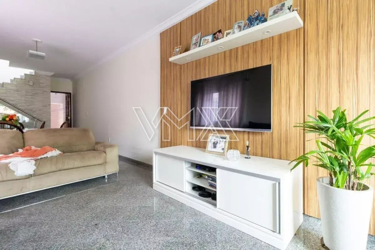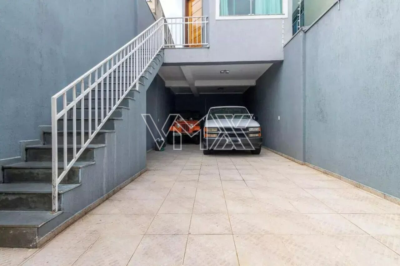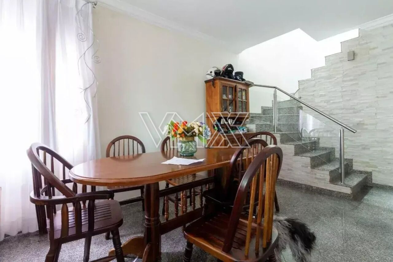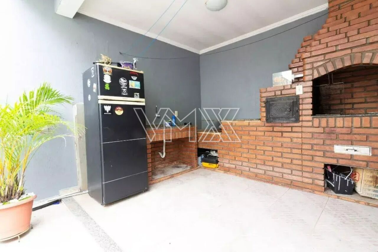São três dormitórios, sendo uma suíte, além de uma ampla sala de estar, banheiro social, lavabo, cozinha equipada com armários planejados e ótima distribuição interna. Na área externa, o sobrado conta com corredor lateral, quintal espaçoso e uma completa área de lazer com churrasqueira, forno a lenha e banheiro de apoio. A área de serviço é funcional e o imóvel oferece até seis vagas de garagem, um grande diferencial na região.